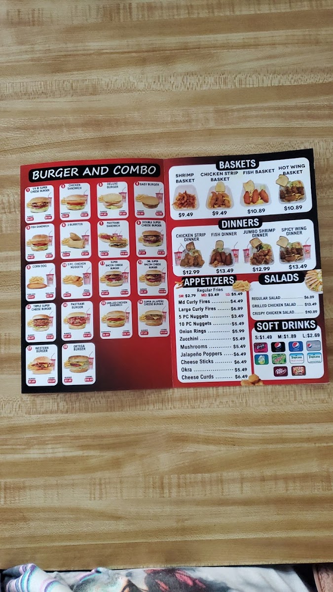 This menu is suitable for those seeking fast, casual meals focused on burgers and fried baskets, complemented by classic soft drinks and a broad selection of milkshakes. It provides options for individual meals or combination plates, accommodating quick dining and takeout preferences.