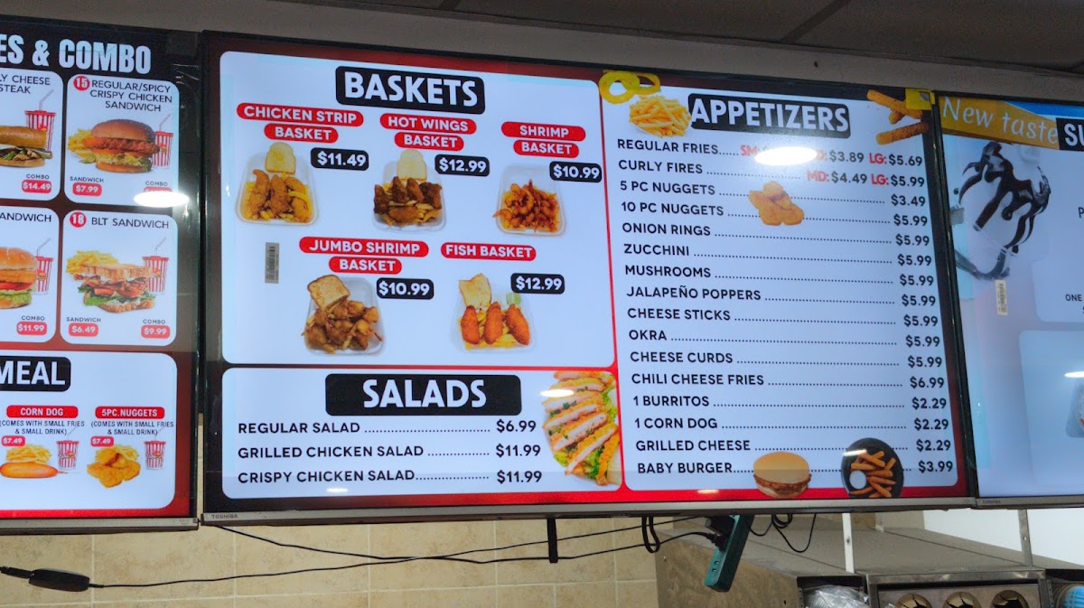 The menu at this fast food restaurant offers a variety of classic and specialty burger options, complemented by a selection of sides, baskets, and beverages. The food selection is designed primarily for casual dining and quick orders, suitable for lunch or dinner.